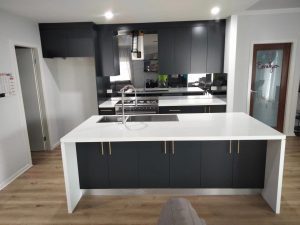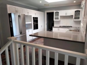 Client replaced the benchtop and splashback. We sprayed all the timber cabinets in Casper white and refitted new handles with amazing results!